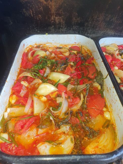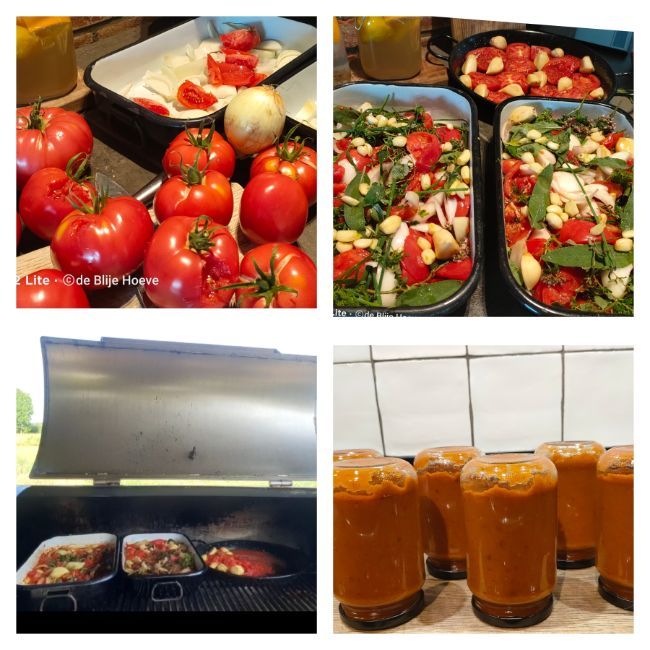 Geplaatst: 7 augustus 20223 j Joep en Jorieke kwamen knorretjes ophalen en brachten een doos tomaten mee.( Niet gewogen maar was zo rond de 4 kg. Vandaag de saus op de BBQ gemaakt. Ik hoop dat wij van de winter de heerlijke zomer BBQ geur en smaak nog proeven. Tomaten, groen eraf en in grove stukken. Heeel veel knoflook 4 uien Kruiden uit tuin, oregano,bieslook, Thijm, sali, basilicum,1 peper Met tak en al. Alles in 3 schalen op de BBQ gelegd al met al wel een uur geprutteld. Daarna af laten koelen( ben gaan grasmaaien) De takken eruit gepulkt en alles in de blender, kook overheen. Jampotten uitgekookt en. Voila...... Ready voor pasta, soep of andere tomaten basis. Heel klein beetje zout en peper Alleen de peper kwam niet uit moestuin . Hopelijk smaakt het. Thnx Jorieke. https://www.deblijehoeve.nl/