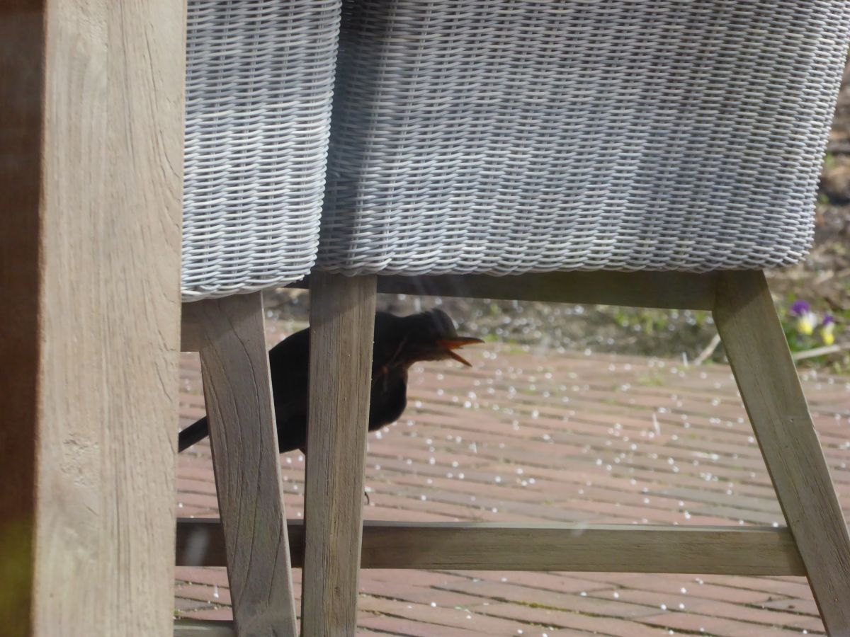 Geplaatst: 5 april 20214 j Vreselijk koude noordenwind, de vogels zoeken beschutting en zitten bij toerbeurt onder mijn tuintafel en in de tuinstoelen op de luwe zuidkant. De merels komen aanrennen, kop in de wind, lijken op ouwe grumpy mannetjes. Mezen vliegen af en aan. We blijven bijvoeren, ze hebben het hard nodig met die koude.